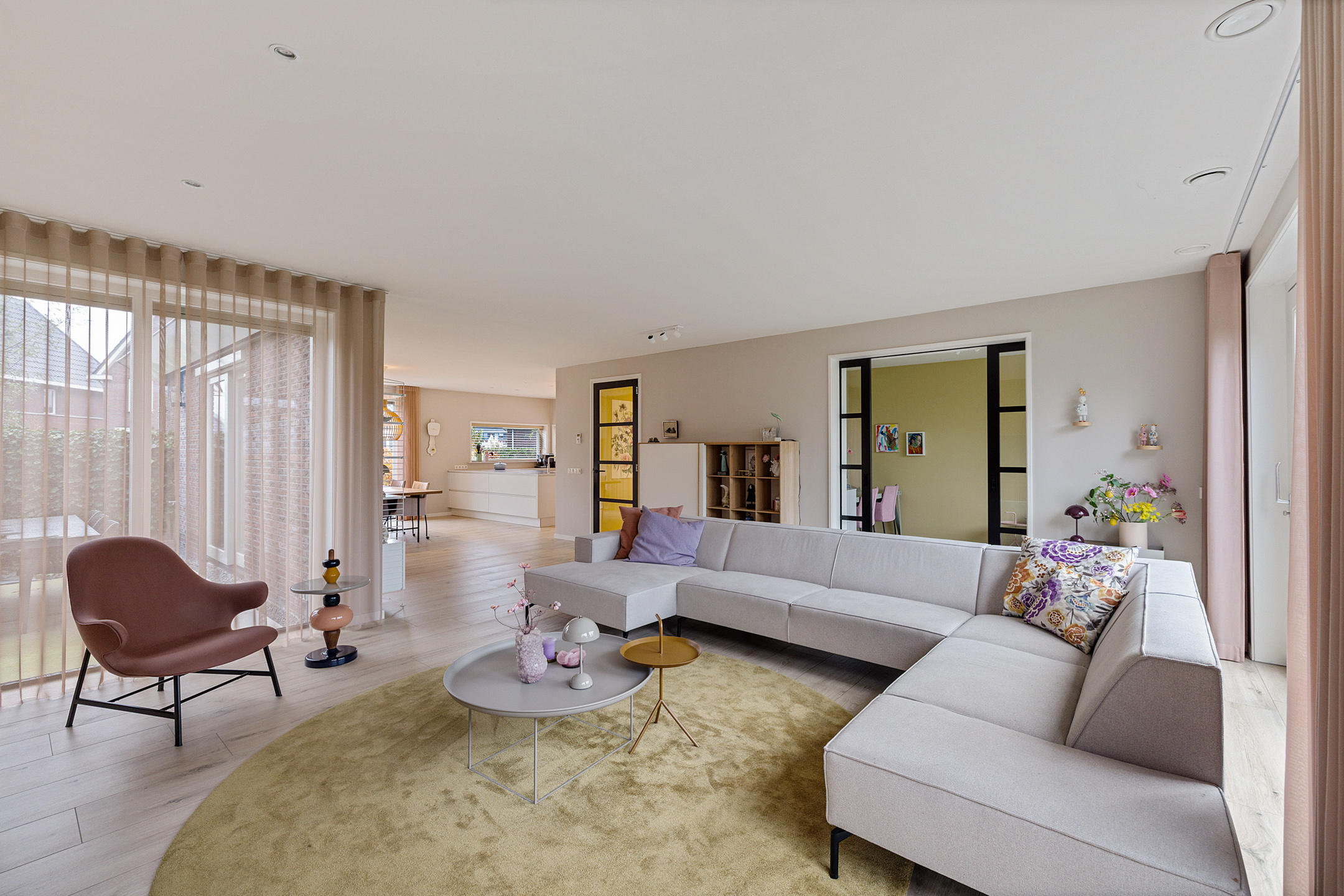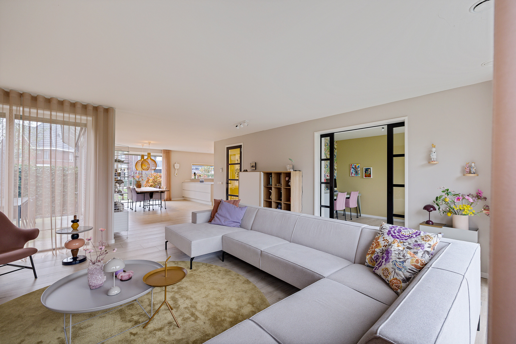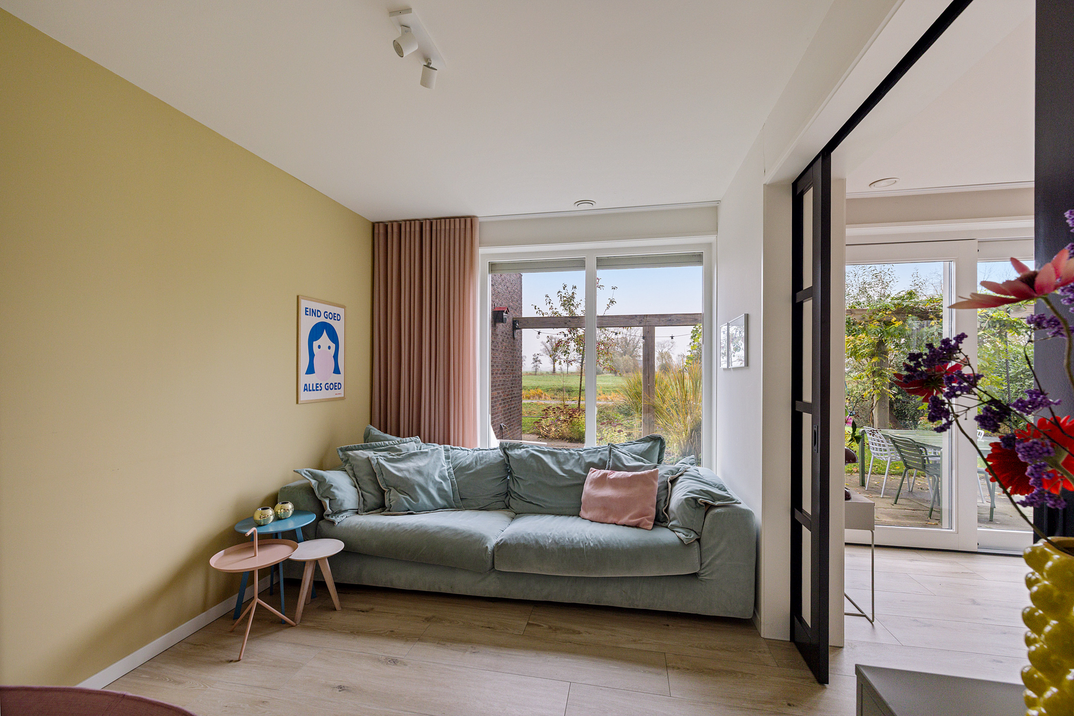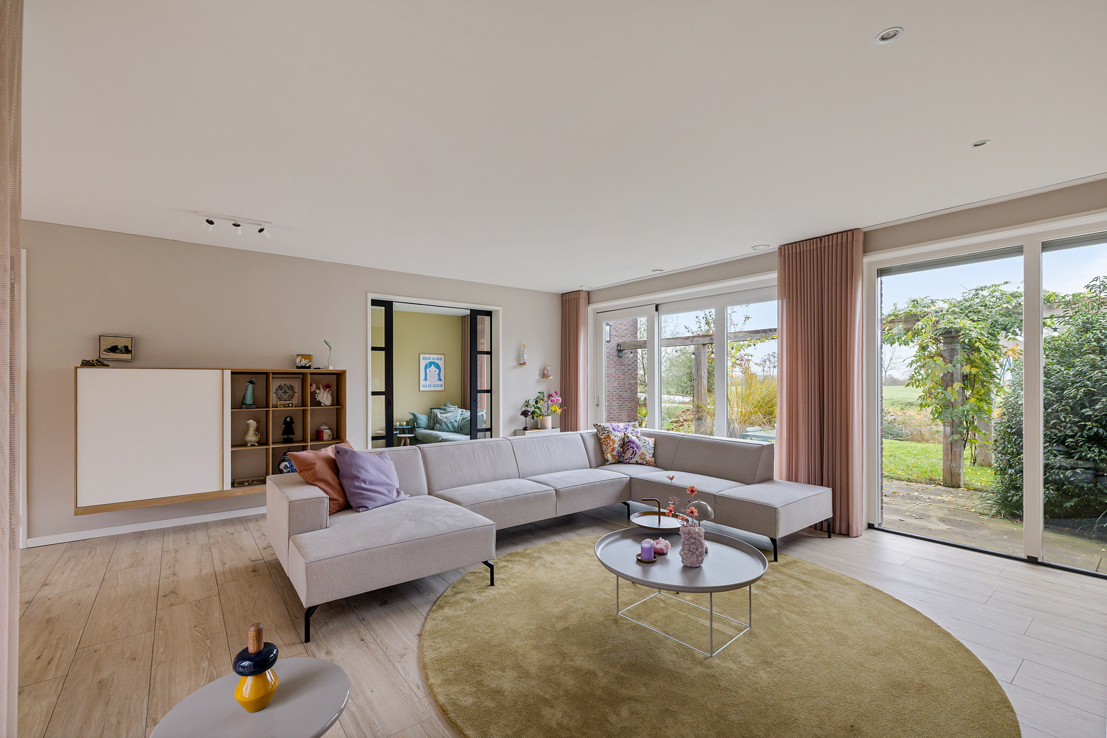 - ruime living, onderverdeeld in een woonkamer met schuifpui naar de achtertuin, een afsluitbare hobby-/werkruimte en fijne leefkeuken